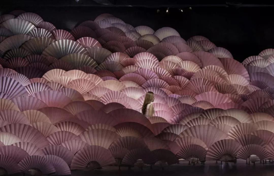 “晨雾”由轻质面料构成的天花板装置,并采用风向控制的同步运动,悬浮或零重力的感觉营造了梦幻的效果,这样的视觉概念与舞蹈表演相结合,渲染了现场的空灵感受,让场景变得非常梦幻。