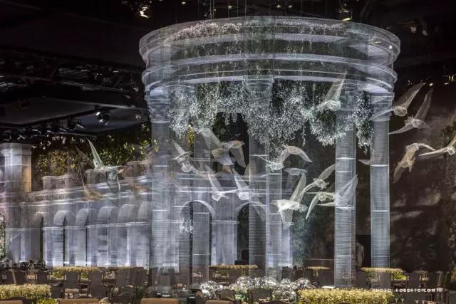 这座虚幻的宫殿罗马式的穹顶和整齐排列的圆柱,Tresoldi将古典与现代的语言融合,一根根巨大的罗马柱撑起的连廊有序的将宾客座位席分隔开,后面的绿植若隐若现,为建筑增添了更多的生命力,当灯光打到建筑上,整个场景犹如3D全息投影效果,虚无缥缈中又带了些真实感。