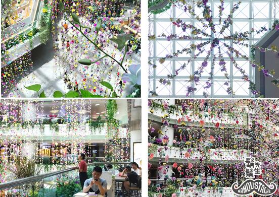 广州天河城21周年庆“生如夏花”主题花艺空间美陈由北广场、中庭、中庭垂花、中庭绿植壁挂、北大堂立柱等组成;打破传统花瓶器皿和空间限制,发挥灵感创意;利用商场建筑体本身以及现场空间灵感而再造。