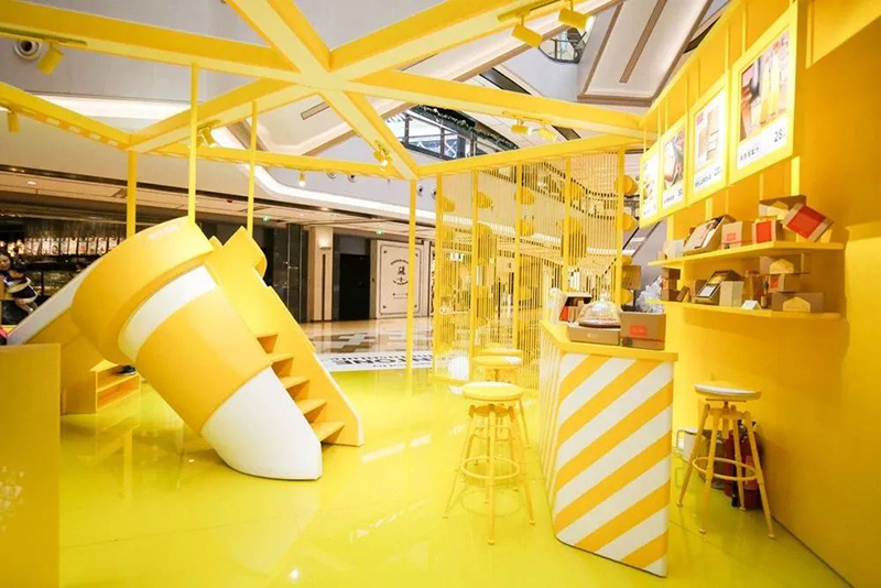 四种颜色的场景美陈延伸打造出了混嗲颜究所、混嗲潮作坊、混嗲食验室、混嗲乐活馆四大主题馆,并且每周都会有相关业态的不同的品牌入驻。