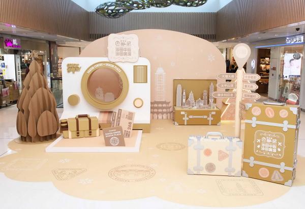 香港沙田中心的色廊场景美陈就以旅游为主题,有奶茶色的纸制立体圣诞树,以及放大版行李箱、机票、护照、巨型即影即有相机等。