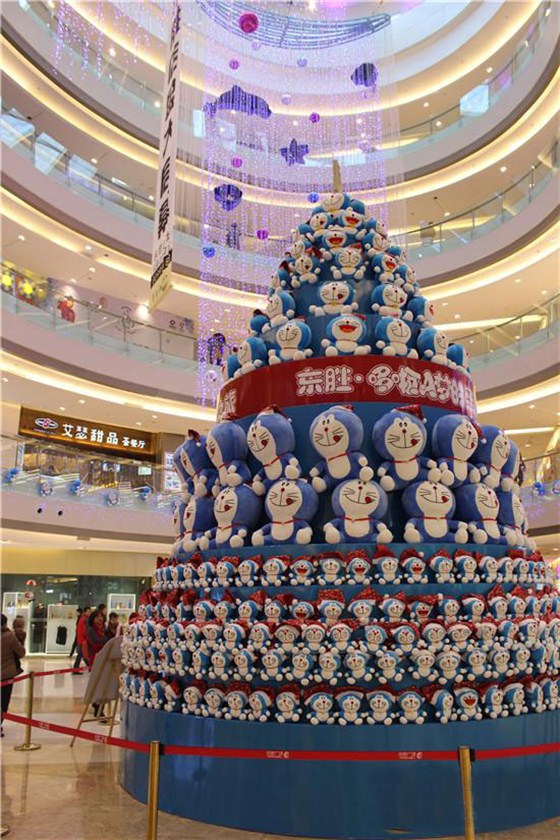 石家庄东胜广场:石家庄东胜广场的圣诞美陈以7米高,5米直径的“哆啦A梦圣诞塔”一跃成为亮点。由500多个大小不一的哆啦A梦组成,引来拍照者无数,也充分彰显了东胜广场以体验式儿童消费为主的定位。